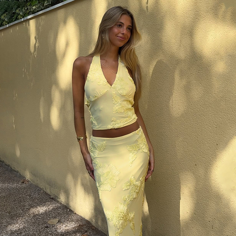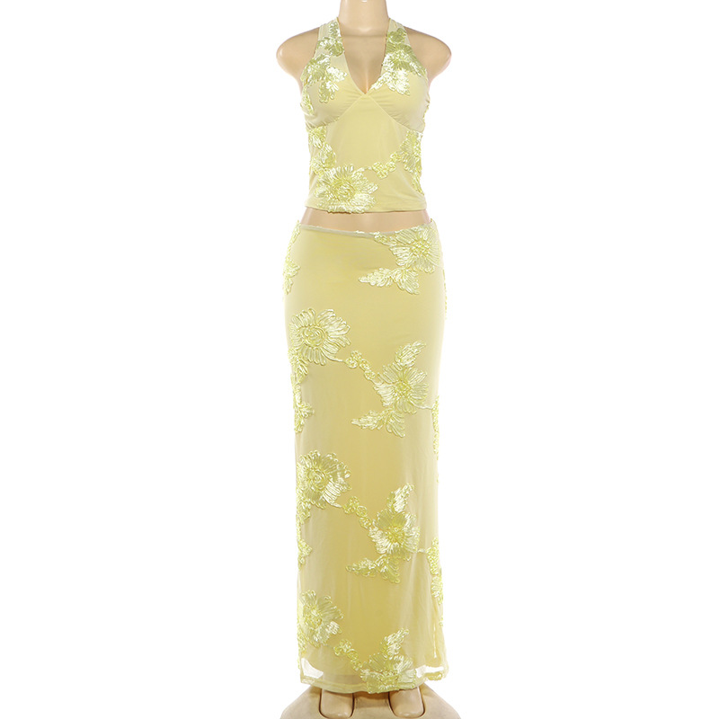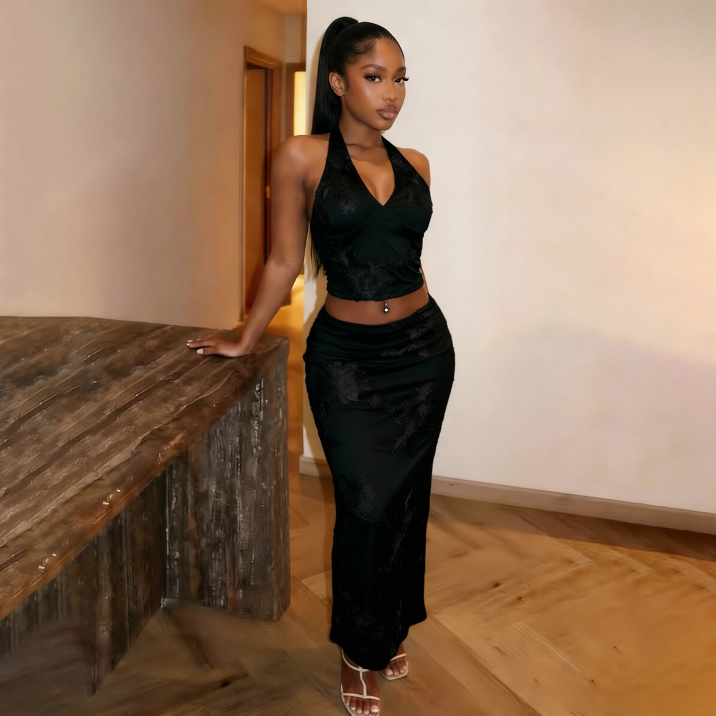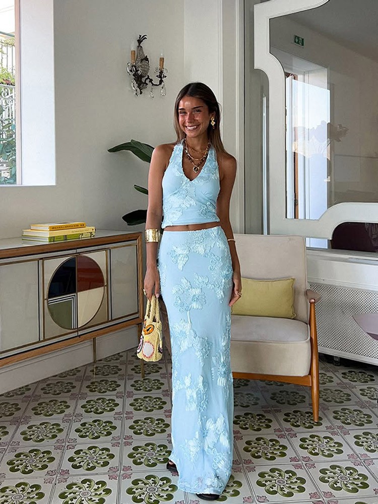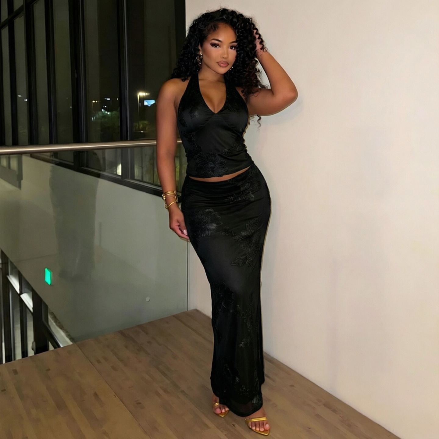 Features: 3D jacquard pattern, halter neck sleeveless cut, slim-fit long dress set
