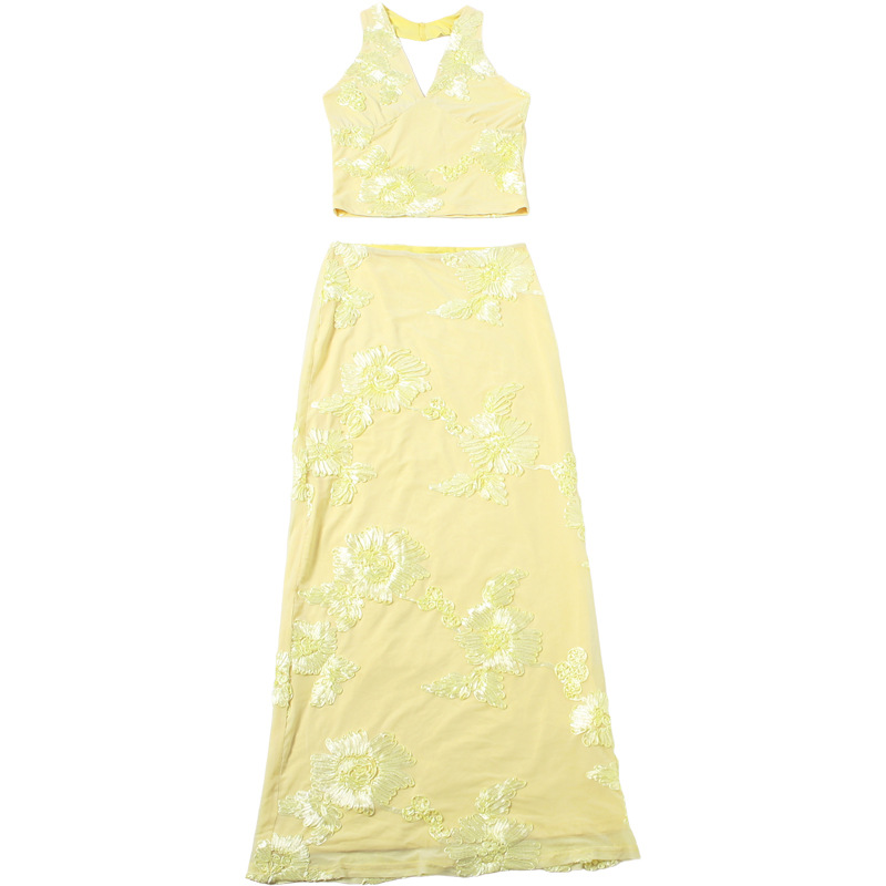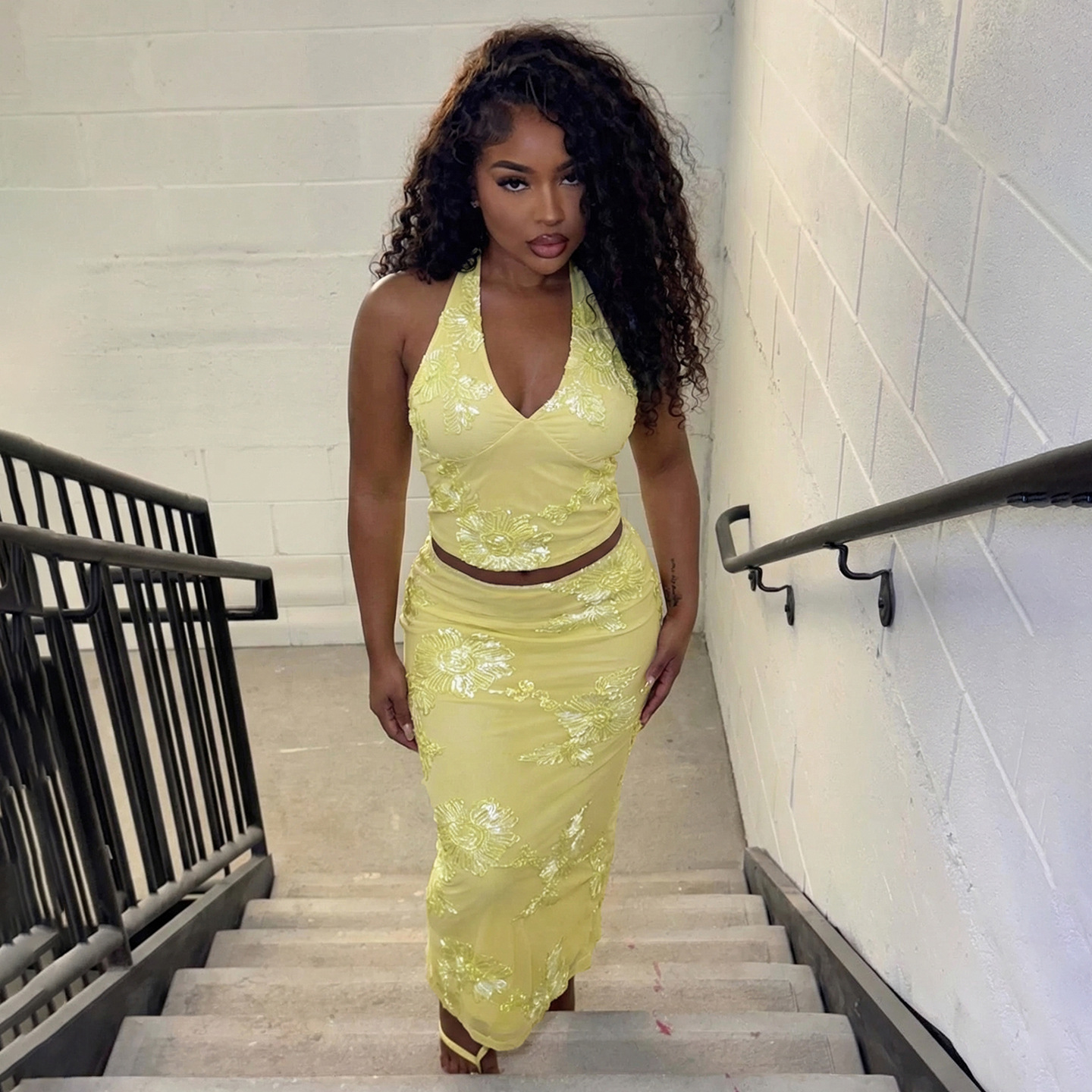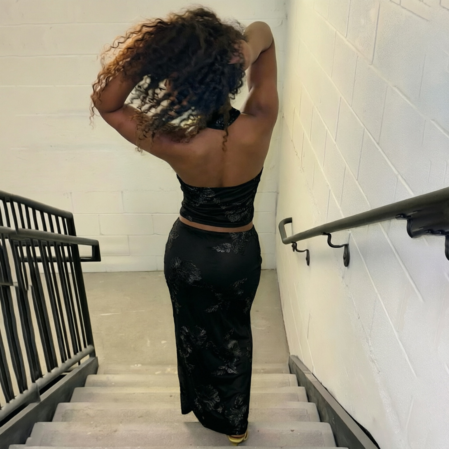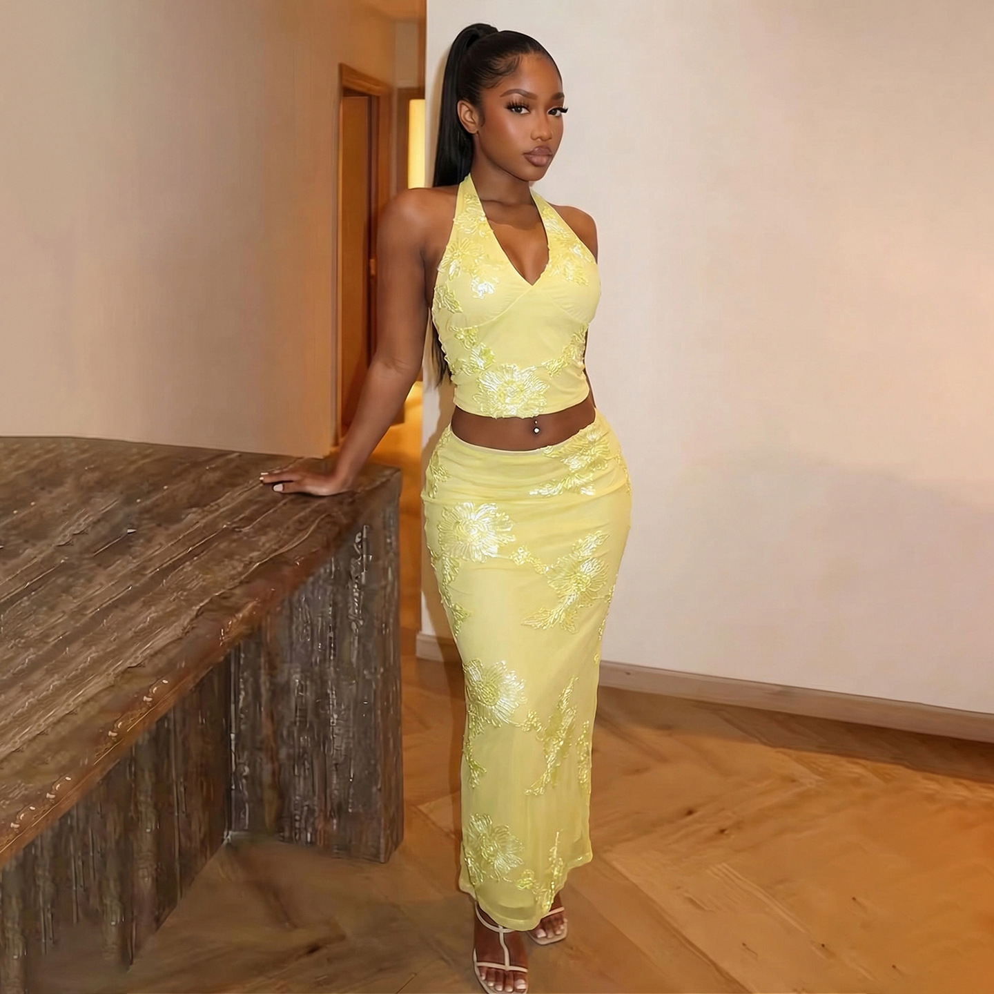 Features: 3D jacquard pattern, halter neck sleeveless cut, slim-fit long dress set